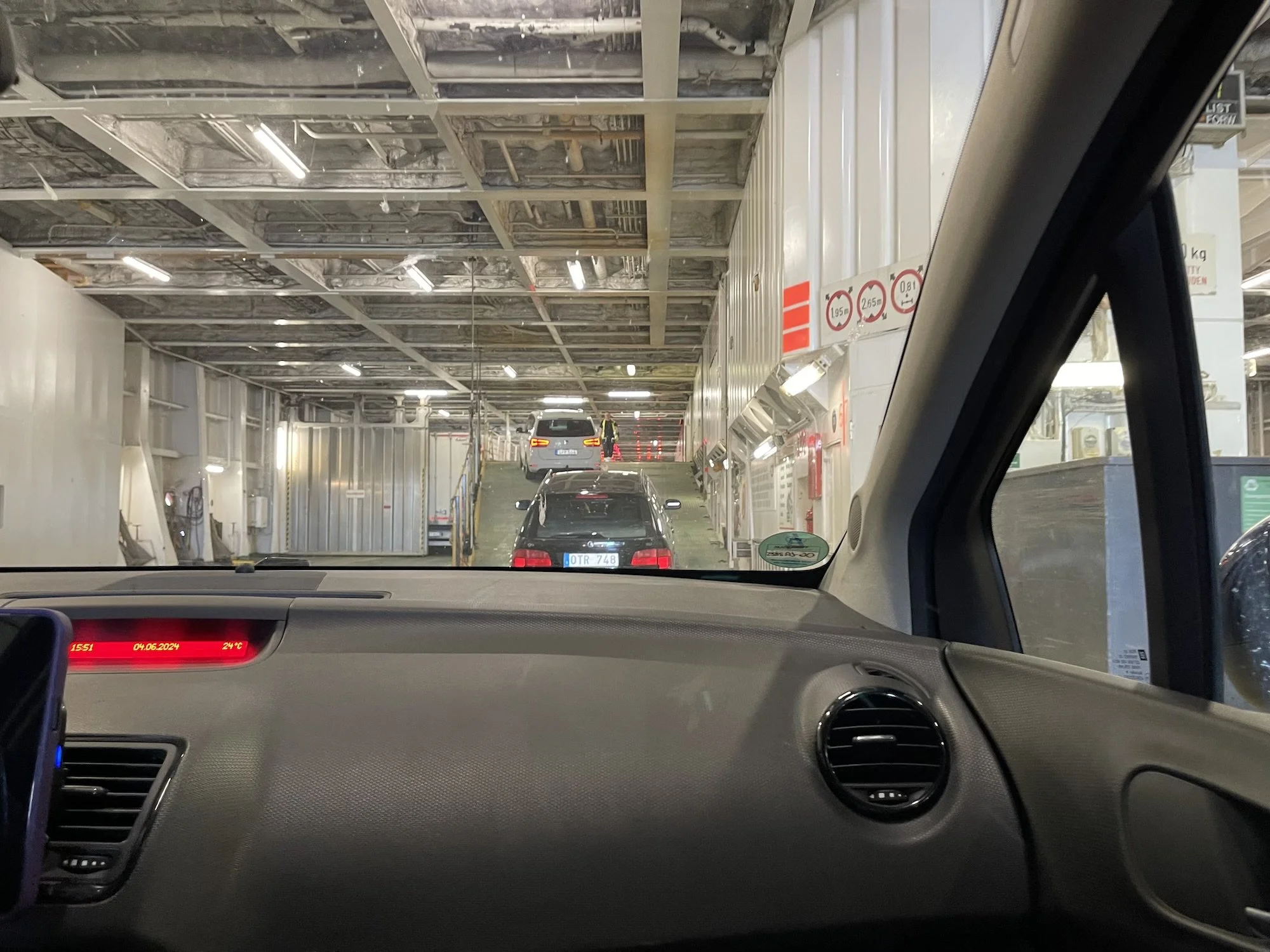 Als man dann endlich auf das Schiff fahren durfte, ging es ziemlich schnell. In den Bauch vom Schiff reinfahren.