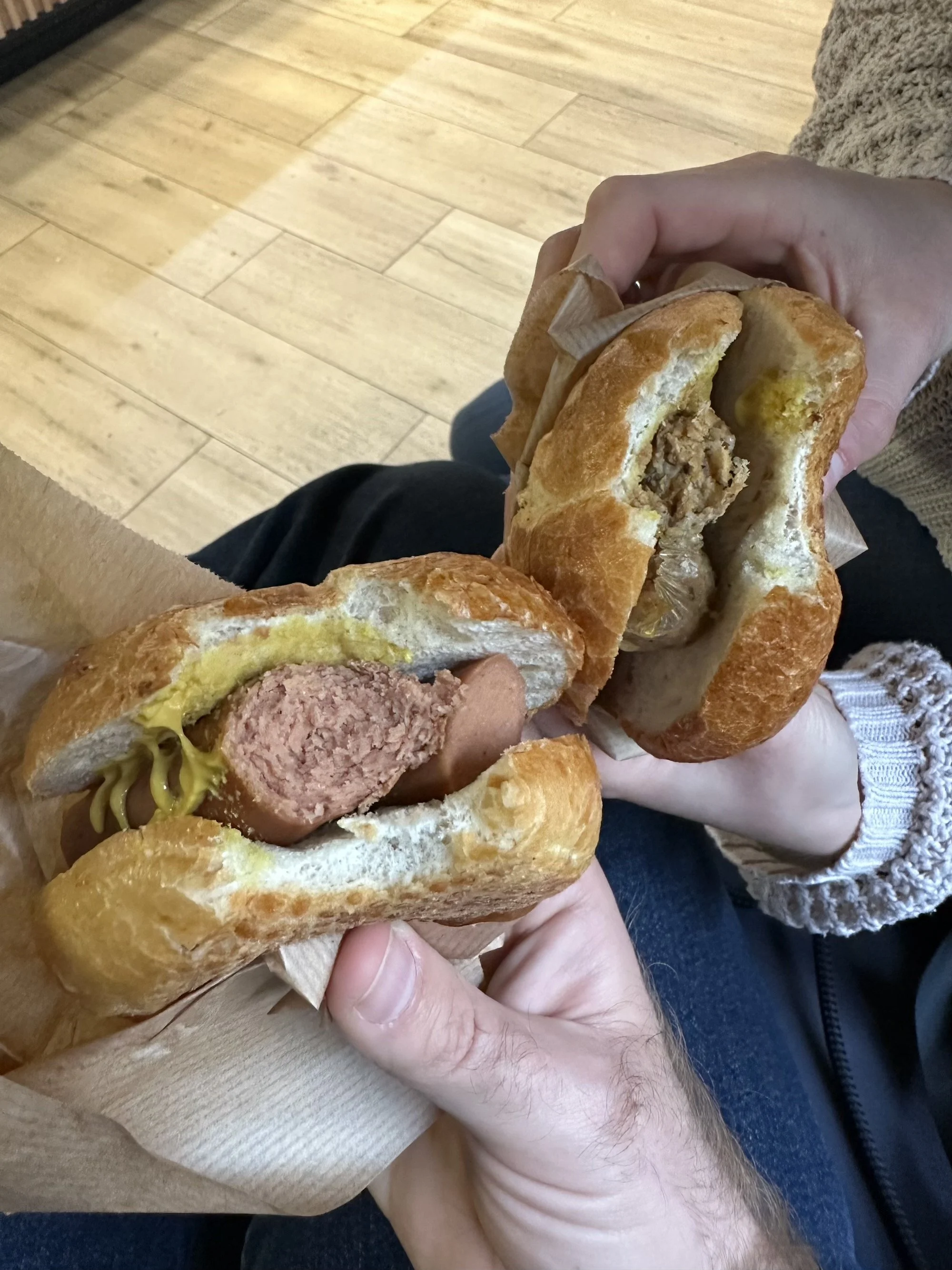 Wir waren nämlich in der veganen Fleischerei und haben uns eine Wurst im Weck geholt. Eigentlich hatten wir es auf die Schnitzelwecken abgesehen, die waren aber leider schon aus.