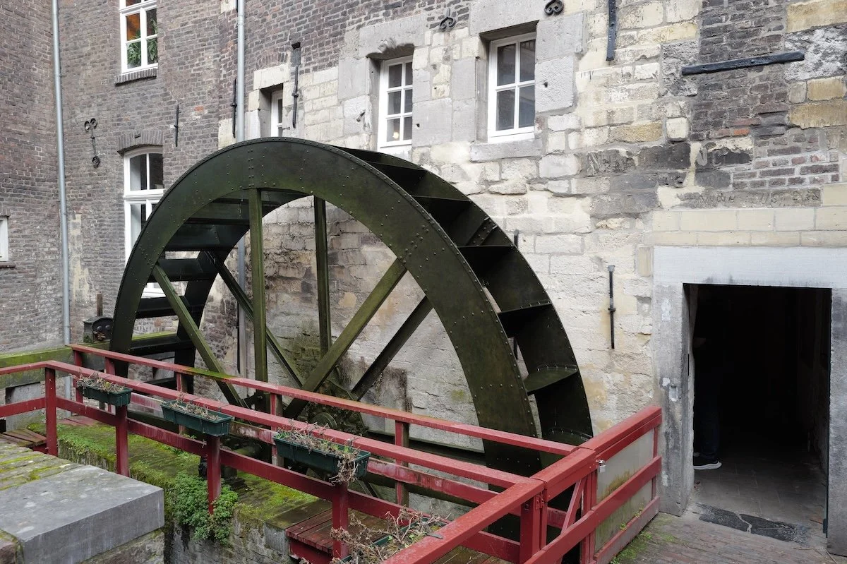 Bei dem ältesten Wasserrad gibt es eine Bäckerei die Vlaai verkaufen, das ist ein traditionalles Gebäck, wie Kuchen, aus der Region Limburg hier.